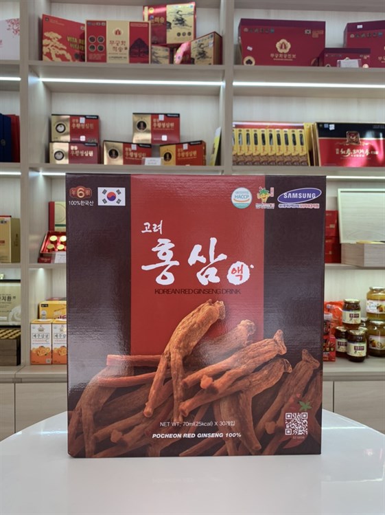 Nước hồng sâm Hàn Quốc Pocheon là sản phẩm được bào chế dạng nước uống được đóng gói nhỏ 70ml tiện dụng, hộp lớn gồm 30 gói nhỏ, bao bì sang trọng đẹp mắt thích hợp để sử dụng làm quà biếu tặng dành cho sức khỏe gửi đến những người thân yêu trong gia đình.